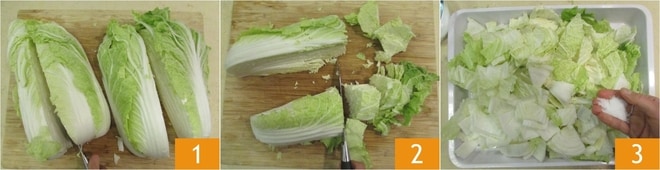 Um das Kimchi zuzubereiten, beginnen Sie mit dem Chinakohl: Nachdem Sie ihn gewaschen haben, schneiden Sie ihn zuerst in Viertel 1 und dann in grobe Stücke 2. Verteilen Sie den Kohl auf einem Tablett und bestreuen Sie ihn mit Salz 3, rühren Sie um und lassen Sie ihn etwa 30 Minuten ziehen. Nach dieser Zeit erneut umdrehen und weitere 30 Minuten ruhen lassen.