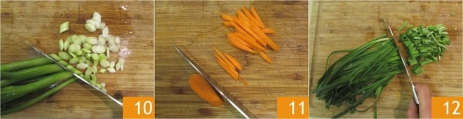 Putzen Sie die Frühlingszwiebeln und schneiden Sie sie in etwa einen halben cm dicke Scheiben 10. Reinigen Sie auch die Karotten und schneiden Sie sie in Streifen 11. Schneiden Sie schließlich den chinesischen Knoblauch in etwa 1 cm große Stücke 12.