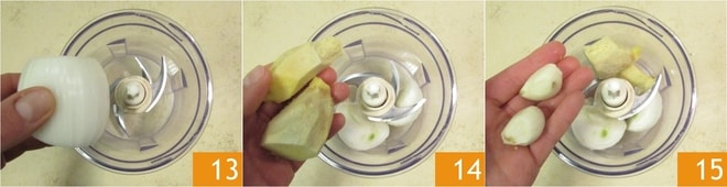 Gehen Sie zur Ingwerpaste über: Schälen Sie die Zwiebel und geben Sie sie in einen Mixer 13 zusammen mit dem geschälten Ingwer 14 und den Knoblauchzehen 15.