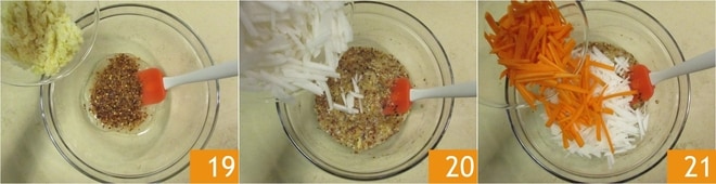 Fügen Sie die Ingwerpaste 19, den Daikon 20 und die Karotten 21 hinzu.