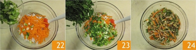 Fügen Sie auch die Frühlingszwiebel 22 und den chinesischen Knoblauch 23 hinzu, dann rühren Sie mit einem Spatel um 24.