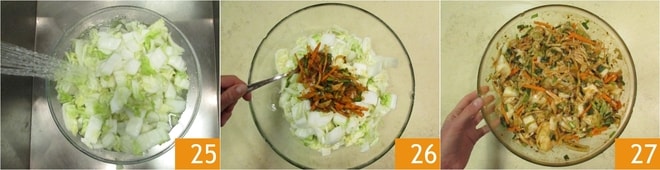 Nach der Ziehzeit des Chinakohls, spülen Sie ihn unter fließendem Wasser ab 25 und lassen Sie ihn gut abtropfen. Geben Sie den Kohl in eine Schüssel und fügen Sie das scharfe Gemüse hinzu 26. Mischen Sie mit den Händen, um alles gut zu vermengen 27.