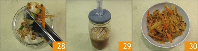 Übertragen Sie das Kimchi in ein Glasfermentationsgefäß 28, fügen Sie das Gewicht hinzu, falls es im Fermentationsset enthalten ist, und verschließen Sie es mit dem Deckel. Lassen Sie es mindestens eine Woche an einem kühlen Ort ohne direkte Lichtquellen oder im Kühlschrank für mindestens 2 Wochen fermentieren 29. Nach dieser Zeit ist Ihr Kimchi bereit zur Verwendung 30!