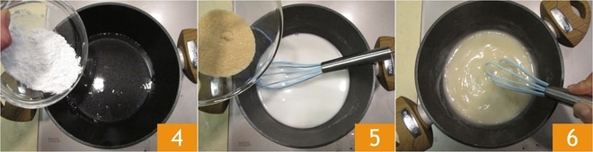 Bereiten Sie inzwischen die Reissauce vor: Gießen Sie das Wasser in einen kleinen Topf zusammen mit dem Reismehl 4 und dem braunen Zucker 5. Rühren Sie mit einem Schneebesen und kochen Sie bei niedriger Hitze, bis eine gelartige Mischung entsteht 6.