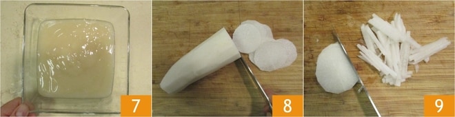Übertragen Sie die Reissauce in eine Schüssel und lassen Sie sie bei Raumtemperatur abkühlen 7. Widmen Sie sich nun den restlichen Zutaten: Schälen und schneiden Sie den Daikon zuerst in Scheiben 8 und dann in dünne Stäbchen 9.