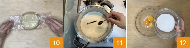 Wickeln Sie ihn in Frischhaltefolie 10. Stellen Sie ihn für mindestens 30 Minuten in den Kühlschrank. In der Zwischenzeit die Vanillecreme zubereiten. Erhitzen Sie die Milch mit der Vanilleschote und den Samen in einem Topf 11. In der Zwischenzeit drei Eigelb, den Zucker 12