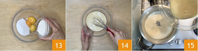 und das Mehl in eine Schüssel geben 13. Mit einem Schneebesen gut schlagen, um eine gut vermischte und leicht aufgeschlagene Masse zu erhalten 14. Wenn die Milch kurz vor dem Kochen ist, die Hitze ausschalten, die Eigelb mit Zucker und Mehl hineingeben 15.