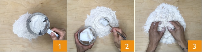 Um den Pasticciotto-Kuchen zuzubereiten, bereiten Sie zuerst den Mürbeteig vor. Auf einer Arbeitsfläche das Mehl sieben 1 und eine klassische Fontäne formen. In die Mitte das Schmalz geben 2 und schnell mit den Händen zu einem krümeligen Teig verarbeiten 3.