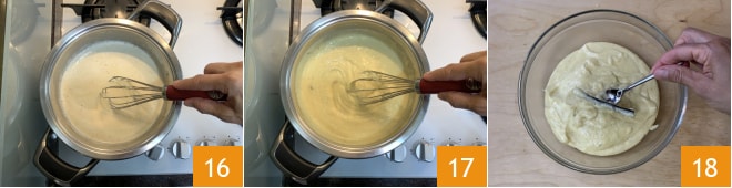und mit einem Schneebesen rühren 16. Den Herd erneut auf niedrige Flamme stellen und einige Minuten rühren, bis die Creme eindickt 17. Sobald die Creme eingedickt ist, in eine Schüssel umfüllen, die Vanilleschote entfernen 18,