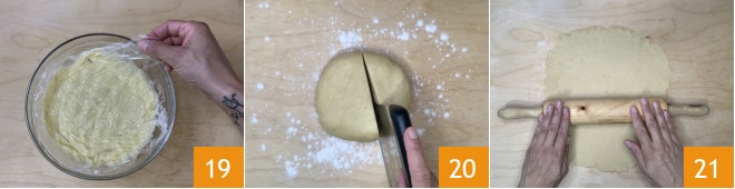mit Frischhaltefolie direkt auf der Oberfläche abdecken 19 und abkühlen lassen. Wenn die Creme Zimmertemperatur erreicht hat und der Mürbeteig geruht hat, nehmen Sie den Teigballen, entnehmen Sie ein Drittel davon und legen Sie ihn zur Seite. Nehmen Sie den größeren Teil und rollen Sie ihn mit einem Nudelholz aus 23, um eine Scheibe von 24 cm mit einer Dicke von etwa 1 cm zu erhalten.