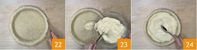 Verwenden Sie den Teig, um eine runde Form von 20 cm auszulegen, da er größer ist, wird es Ihnen leichtfallen, auch die Ränder gut auszukleiden. Mit einem kleinen Messer entfernen Sie den überschüssigen Teig, der aus der Form herausragt 22. Geben Sie die Vanillecreme hinein 23 und glätten Sie sie mit der Rückseite eines Löffels.