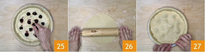 Legen Sie dann die eingelegten Amarenakirschen, indem Sie sie voneinander distanzieren 25. Nehmen Sie den zur Seite gelegten Teig und rollen Sie ihn aus, um eine Scheibe von 18 cm und einer Dicke von 1 cm zu erhalten. Platzieren Sie ihn in der Mitte der Torte und klappen Sie die Ränder der unteren Schicht darauf um und verschließen Sie sie mit den Fingern 27.