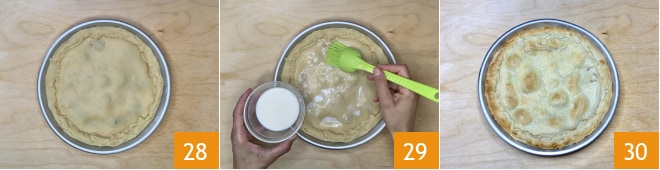Wenn Sie fertig sind 28, die Oberfläche mit Milch bestreichen 29 und im vorgeheizten statischen Ofen bei 170° für etwa 50 Minuten backen. Am Ende der Backzeit aus dem Ofen nehmen 30 und den Pasticciotto-Kuchen vollständig in der Form abkühlen lassen, bevor Sie ihn herausnehmen und servieren.