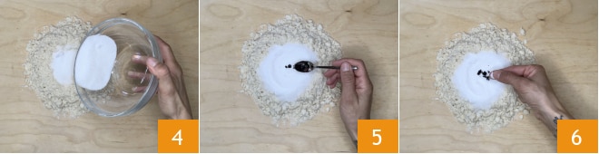Erneut die Fontäne formen und in die Mitte den Zucker 4, die Samen der halben Vanilleschote und eine Prise Salz 6 geben.