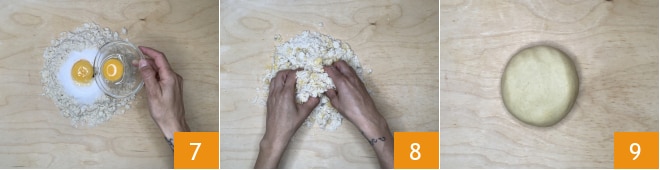 und zwei Eigelb 7. Kneten Sie dann mit den Händen 8, bis Sie eine homogene Masse erhalten haben und formen Sie einen Teigball 9.