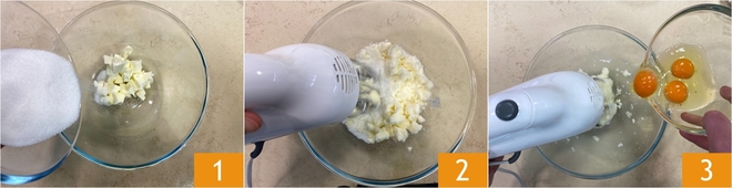 Um den klassischen Kastenkuchen zuzubereiten, gebt zunächst die weiche Butter und den Zucker in eine Schüssel 1. Schlagt mit dem Handmixer etwa zehn Minuten, bis die Masse luftig aufgeht 2. Dann die Eier nacheinander hinzufügen 3.
