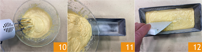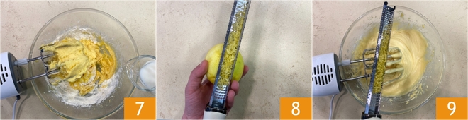 Rührt die Milch ein 7, reibt die Zitronenschale ab 8 und gebt sie zur Masse 9.