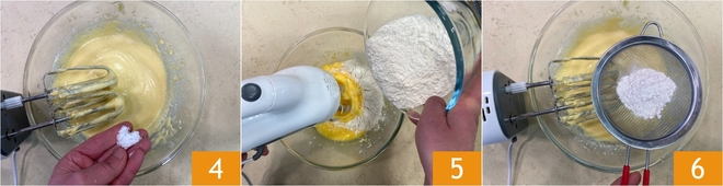 Dann fügt eine Prise Salz hinzu 4, das vorher gesiebte Mehl 5 und anschließend das gesiebte Backpulver 6.