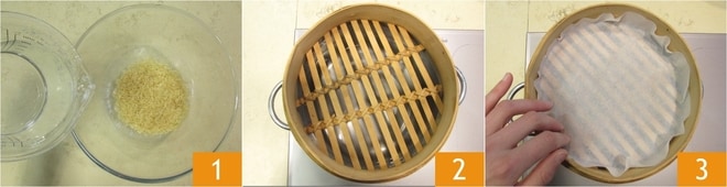 Um den Sticky Rice zuzubereiten, legen Sie zuerst den Reis für eine Stunde in Wasser ein 1. Nach dieser Zeit bringen Sie einen Topf Wasser zum Kochen, dann stellen Sie einen Dampfgarer 2 mit einem Stück Backpapier auf den Boden 3 darüber.
