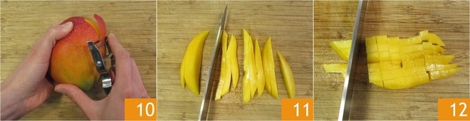 In der Zwischenzeit die Mango schälen 10 und zuerst in Scheiben 11 und dann in Würfel 12 schneiden.