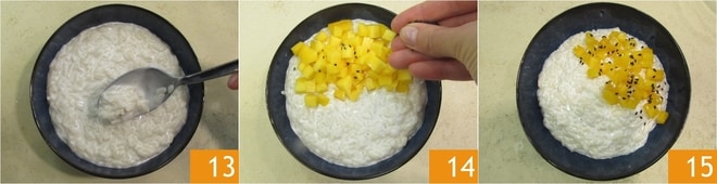 Wenn der Reis fertig ist, in eine Schüssel geben und etwas abkühlen lassen 13, dann mit der Mango und den Sesamsamen garnieren 14. Ihr Sticky Rice ist bereit, warm oder kalt serviert zu werden 15!