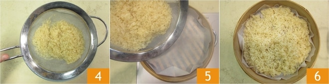 Den Reis abgießen 4 und in den Dampfgarer 5 geben, dann den Deckel schließen und 15 Minuten lang kochen 6.