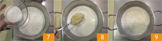 In der Zwischenzeit die Kokosmilch mit dem Zucker in einem kleinen Topf erwärmen 7. Sobald der Reis gekocht ist, diesen ebenfalls hinzufügen 8 und die Mischung erneut aufkochen lassen. Dann die Hitze reduzieren und 10 Minuten lang unter gelegentlichem Rühren kochen 9. Es sollte eine cremige Konsistenz erreicht werden.