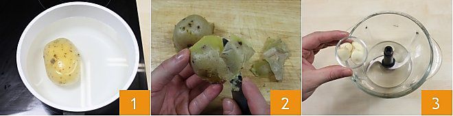 Um die Knoblauchsauce zuzubereiten, waschen Sie die Kartoffel gut und kochen Sie sie in Salzwasser mit der Schale 1; wenn sie gar ist (stechen Sie mit einer Gabel hinein, um die Garzeit zu überprüfen), lassen Sie sie abtropfen und abkühlen. Sobald sie kalt ist, schälen Sie sie 2 und schneiden Sie sie in Stücke. Schälen Sie den Knoblauch und geben Sie ihn in den Mixer 3 (wenn Sie möchten, können Sie auch einen Mörser verwenden).