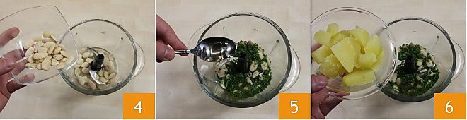 Fügen Sie die geschälten Mandeln hinzu 4, Petersilie, Essig 5, die Kartoffeln 6,