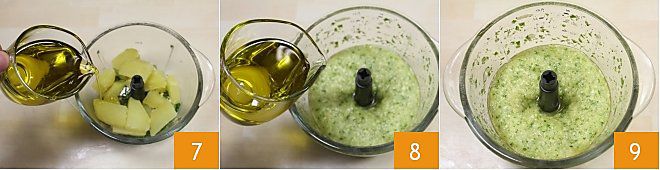 salzen Sie, pfeffern Sie und mixen Sie alles, indem Sie das Öl nach und nach hinzufügen (7-8). Sobald Sie eine dicke Creme erhalten haben, ist die Knoblauchsauce bereit, um mit Ihren Gerichten serviert zu werden 9.