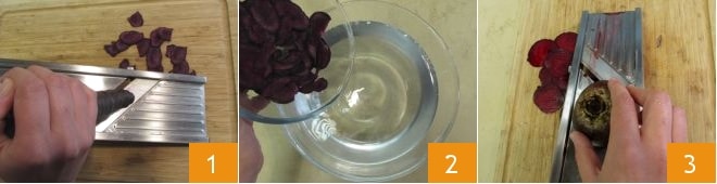Um die Knollenchips und die Ingwer-Mayonnaise zuzubereiten, waschen Sie zuerst alle Knollen gründlich, da Sie sie mit Schale verwenden werden. Bereiten Sie zwei Schüsseln mit Eiswasser vor: Diese werden benötigt, um die hellen von den dunklen Knollen zu trennen. Stellen Sie die Mandoline auf eine Dicke von 1 mm ein und beginnen Sie, alle Knollen vorzubereiten: Schneiden Sie die Enden der violetten Karotten ab, schneiden Sie sie in Scheiben und tauchen Sie sie in eine Schüssel mit kaltem Wasser 2, dann schneiden Sie die Rote Bete 3 und geben Sie die erhaltenen Chips in dieselbe Schüssel.