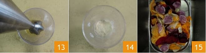 Mischen Sie alles mit einem Stabmixer 13, und Ihre vegane Ingwer-Mayonnaise ist im Handumdrehen fertig 14. Nehmen Sie das Gemüse aus dem Einweichwasser, lassen Sie es gut abtropfen 15.