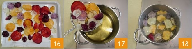 und legen Sie es auf ein mit Küchenpapier ausgelegtes Tablett, um das überschüssige Wasser zu entfernen 16; lassen Sie es beiseite, bis es vollständig trocken ist. Erhitzen Sie das Pflanzenöl in einem Topf, bis es eine Temperatur von 180 °C erreicht (mit einem Küchenthermometer messen) und frittieren Sie die Chips in kleinen Mengen (17-18).