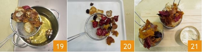 Es dauert nur wenige Augenblicke, bis sie goldbraun und knusprig sind 19. Lassen Sie sie auf einem Tablett mit Küchenpapier abtropfen und versuchen Sie, sie nicht zu stapeln 20, und servieren Sie sofort Ihre Knollenchips mit veganer Ingwer-Mayonnaise 21!