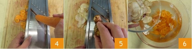Schneiden Sie auch die gelben Karotten und den Topinambur in derselben Dicke, die Sie zuvor abgeschnitten haben (4-5), und tauchen Sie diese Knollen in die andere Schüssel mit Eiswasser 6.