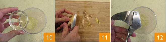 Fügen Sie Salz und Essig hinzu 10. Schälen Sie den Ingwer 11, schneiden Sie ihn in Stücke und drücken Sie ihn mit einer Knoblauchpresse aus, um ihn der Mischung hinzuzufügen 12; alternativ können Sie ihn auch hacken.