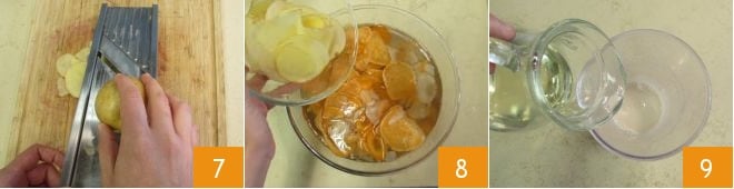 Schneiden Sie auch die Süßkartoffel und die gelbe Kartoffel in Scheiben 7 und tauchen Sie sie ebenfalls in die Schüssel mit den gelben Karotten und dem Topinambur 8. Lassen Sie die Knollenchips etwa 2 Stunden lang einweichen, damit sie sich kräuseln und Stärke verlieren. Kurz bevor Sie sie abtropfen lassen, können Sie die vegane Ingwer-Mayonnaise zubereiten: Gießen Sie die Sojamilch in einen hohen Behälter, fügen Sie das Pflanzenöl hinzu 9.