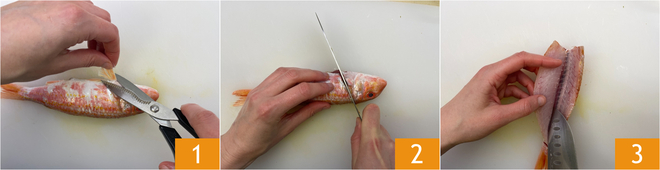 Um die frittierten Rotbarben mit süß-saurer Sauce zuzubereiten, beginnen Sie mit dem Reinigen der Rotbarben: Entfernen Sie die Schuppen und schneiden Sie die Flossen ab 1, dann entfernen Sie den Kopf 2 und lösen Sie die Filets, indem Sie das Messer vorsichtig entlang der Gräte führen 3.