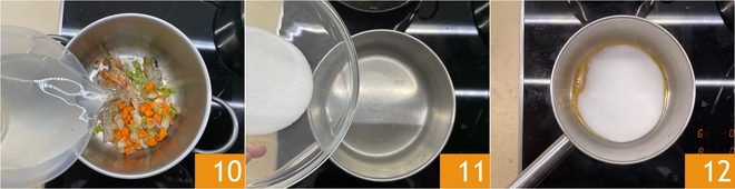 Gießen Sie kaltes Wasser so weit auf, dass Gräten und Gemüse bedeckt sind 10, und lassen Sie alles 30 Minuten leicht köcheln. Anschließend die entstandene Flüssigkeit abseihen, um den Fumetto zu gewinnen, und beiseitestellen. Sobald der Fumetto fertig ist, bereiten Sie die Sauce zu: Geben Sie den Zucker in einen Topf 11 und lassen ihn vorsichtig schmelzen 12, bis ein hellbraunes Karamell entsteht.