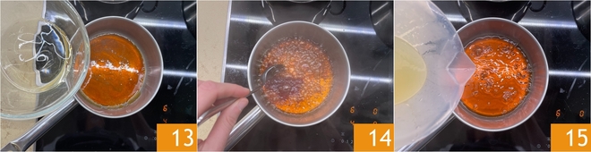 Geben Sie nun den Essig vorsichtig hinzu 13 und lassen Sie ihn etwa 7 Minuten einkochen 14, dann rühren Sie 300 g gefilterten Rotbarben-Fumetto ein 15.