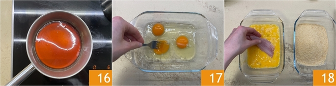 Kochen Sie die Sauce weitere 2 Minuten, bis sie leicht eingedickt ist 16. Widmen Sie sich dann der Zubereitung der Filets: Verquirlen Sie die Eier in einer Auflaufform 17 und geben Sie die Semmelbrösel in eine andere. Tauchen Sie die Rotbarbenfilets zunächst in die verquirlten Eier 18.