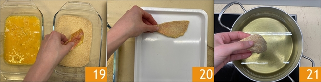 Wenden Sie sie anschließend in den Semmelbröseln 19, drücken Sie die Panade gut an, sodass sie gleichmäßig haftet, und legen Sie die Filets nach und nach auf ein Tablett 20. Zum Frittieren: Erhitzen Sie Erdnussöl auf 170 und tauchen Sie immer nur wenige Filets gleichzeitig hinein 21, damit die Temperatur des Öls nicht zu sehr absinkt.