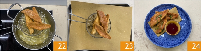 Frittieren Sie die Rotbarben 2–3 Minuten, bis sie goldbraun und knusprig sind, dann lassen Sie sie abtropfen 22 und geben sie auf Küchenpapier 23. Ordnen Sie die frittierten Rotbarbenfilets auf der Servierplatte an, garnieren Sie mit Basilikum und gehackter Petersilie und servieren Sie die süß-saure Sauce separat dazu 24.