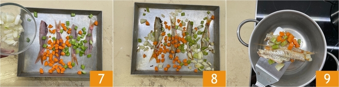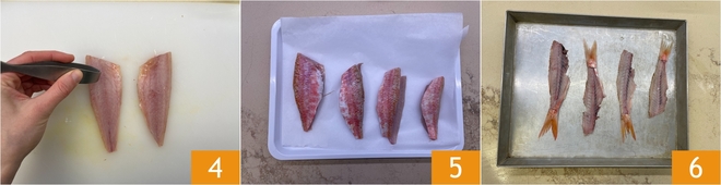 Behalten Sie die Gräten (Lische) und säubern Sie die Filets, indem Sie eventuell verbleibende Gräten entfernen 4. Tupfen Sie sie anschließend mit Küchenpapier gut trocken und legen Sie sie auf ein Tablett in den Kühlschrank 5. Legen Sie die Gräten auf ein Backblech 6.