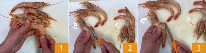Um die knusprigen Garnelen zuzubereiten, beginnen Sie zunächst mit der Wie man Garnelen reinigt: Entfernen Sie die Beine und den Panzer, lassen Sie dabei den Kopf und den Schwanz intakt 1, dann schneiden Sie den Rücken mit einem Messer ein 2 und entfernen den schwarzen Darmfaden 3. Verfahren Sie in dieser Weise, um alle Garnelen zu reinigen, und fahren Sie dann mit der Panade fort.