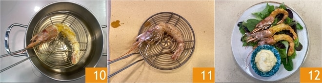 Erhitzen Sie das Pflanzenöl auf eine Temperatur von 180°, dann tauchen Sie eine Garnele nach der anderen mit einem Schaumlöffel ein 10. Wenn sie schön goldbraun ist (das dauert weniger als eine Minute), lassen Sie sie abtropfen und auf Küchenpapier legen 11. Servieren Sie Ihre knusprigen Garnelen mit einer Prise Salz, begleitet von Mayonnaise und einem gemischten Salat 12!