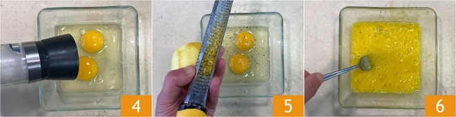 Geben Sie die Eier in eine Schüssel zusammen mit dem Salz 4 und der abgeriebenen Zitronenschale 5, dann verquirlen Sie die Mischung mit einer Gabel 6.