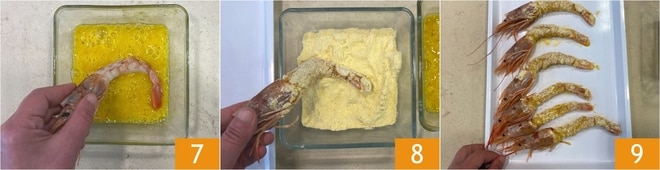 Tauchen Sie das Garnelenfleisch in die Eimischung 7 und bedecken Sie es dann mit dem Maismehl, das Sie in einen anderen Behälter gegeben haben, und achten Sie darauf, dass es gut haftet 8. Legen Sie die panierten Garnelen nach und nach auf ein Tablett 9.
