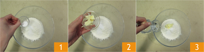 Um die köstlichen Schiacciatine herzustellen, geben Sie Mehl, Salz, eine Prise Natron (von der Gesamtmenge entnommen, ca. 3 g) 1, die weiche Butter 2 und eine Prise Zucker (ca. 3 g) in eine Schüssel. Gießen Sie das Wasser nach und nach hinzu 3.