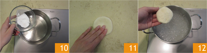 Inzwischen einen Topf mit 2 Litern Wasser auf den Herd stellen; sobald es kocht, 35 g Natron hinzufügen 10. Nehmen Sie eine Kugel und drücken Sie sie mit den Fingern zu einer Scheibe von ca. 8 cm Durchmesser 11. Tauchen Sie die Fladen 30–40 Sekunden in das kochende Wasser 12.